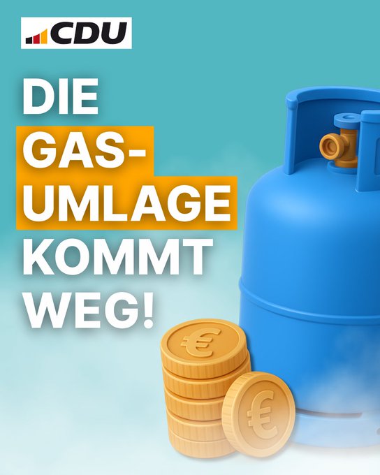 Versprochen ? gehalten! Die Bundesregierung schafft die Gasspeicherumlage ab. Das heißt für private Haushalte und Unternehmen: weniger Kosten beim Gasverbrauch. Versprochen der @CDU eingehalten! https://t.co/2l6M97sjgu
