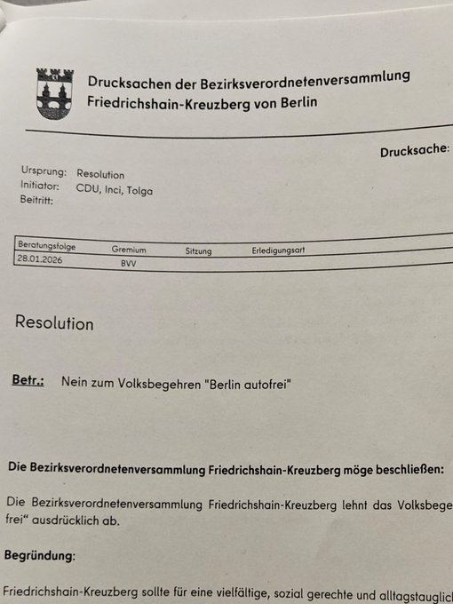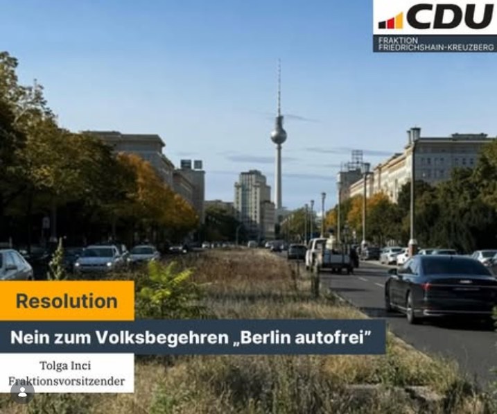 Heute bringt unsere CDU-Fraktion Friedrichshain-Kreuzberg eine Resolution gegen das Volksbegehren "Berlin autofrei" in die Bezirksverordnetenversammlung Friedrichshain-Kreuzberg ein 🚗❌👉 Forderung: eine realistische, soziale und vielfältige Mobilitätspolitik. 🌍⚖️Eine pauschale Begrenzung von Autofahrten lehnen wir ab. Sie trifft 👨👩👧👦 Familien, 👵 ältere Menschen, ♿ Menschen mit Mobilitätseinschränkungen sowie 🔧 Handwerk & 🏪 Gewerbe unverhältnismäßig.🚦 Eine gerechte Wahlfreiheit im Verkehr gelingt mit Ausbau & Anreizen 🚌🚲🚶♂️❌ nicht mit Verboten.
